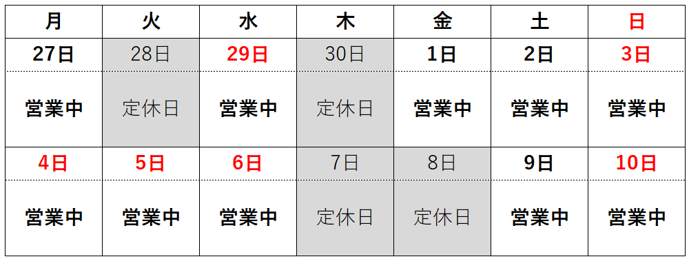 次週より通常(水・木)の定休日となります。